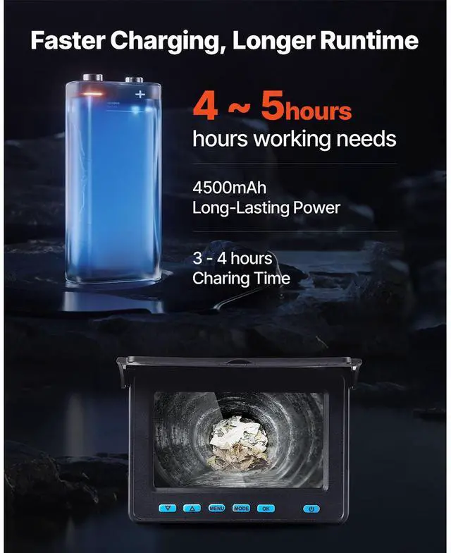 Lens Waterproof Rating: IP68,Operating Temperature: 14 - 122 / -10 - 50 ,LED Light: 6 PCS, 3-Level Adjustable Brightness,Display Screen: 4.3 inch,Viewing Angle: 120° Wide Angle,Product Dimensions: 13.6 x 11.4 x 5.0 inch / 345 x 290 x 128 mm,Lens Diameter: 0.67 inch / 17 mm,Battery Capacity: 4500 mAh,Storage: 16 GB,Item Model Number: WP9602B,Cable Diameter: 0.2 inch / 5 mm,Cable Length: 164 ft / 50 m,Playback Format: AVI (Video), JPG (Photo),Net Weight: 8.8 lbs / 4 kg