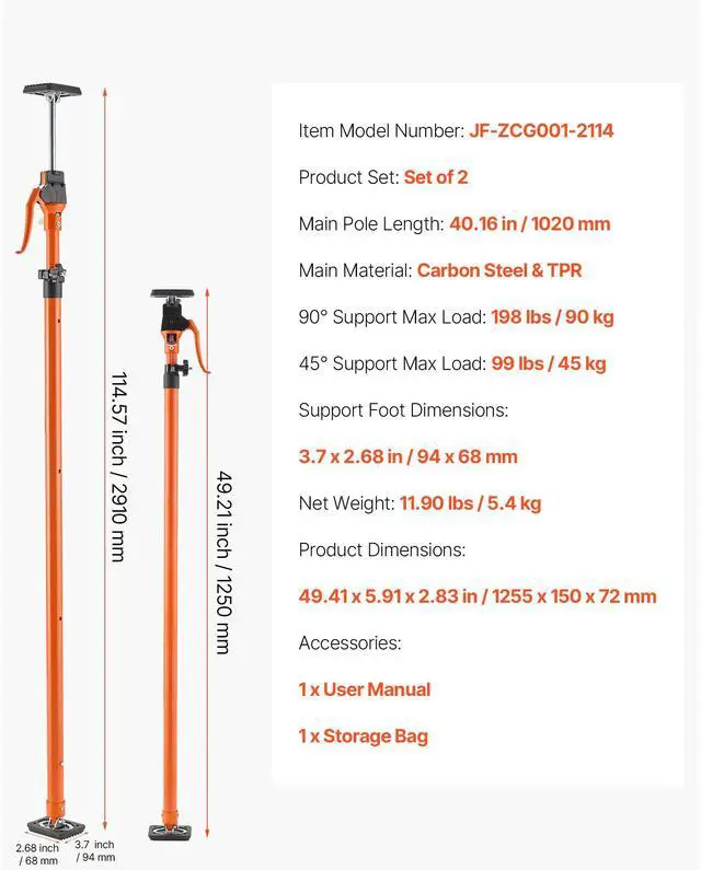 Support Foot Dimensions: 3.7 x 2.68 in / 94 x 68 mm,Item Model Number: JF-ZCG001-2114,Product Set: Set of 2,Main Pole Length: 40.16 in / 1020 mm,Product Dimensions: 49.41 x 5.91 x 2.83 in / 1255 x 150 x 72 mm,Net Weight: 11.90 lbs / 5.4 kg,Main Material: Carbon Steel & TPR