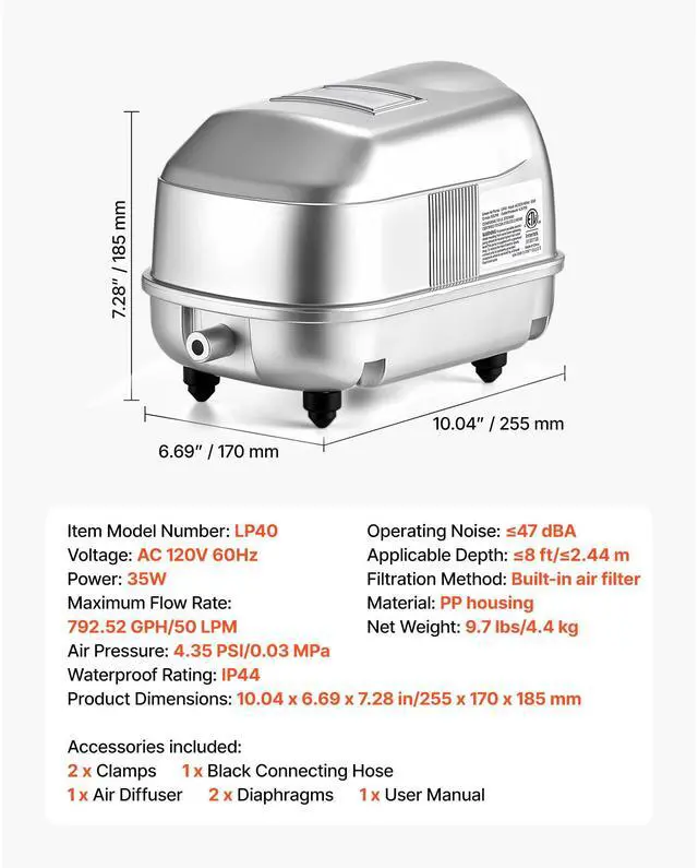 Operating Noise: 47 dBA,Waterproof Rating: IP44,Voltage: AC 120V 60Hz,Item Model Number: LP40,Maximum Flow Rate: 792.52 GPH/50 LPM,Air Pressure: 4.35 PSI/0.03 MPa,Applicable Depth: 8 ft/2.44 m,Material: PP housing,Filtration Method: Built-in air filter,Product Dimensions: 10.04 x 6.69 x 7.28 in/255 x 170 x 185 mm,Net Weight: 9.7 lbs/4.4 kg,Power: 35W