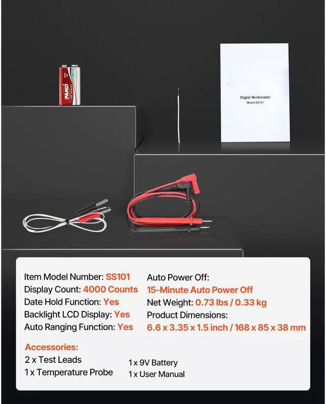 Auto Power Off: 15-Minute Auto Power Off,Date Hold Function: Yes,Item Model Number: SS101,Display Count: 4000 Counts,Auto Ranging Function: Yes,Product Dimensions: 6.6 x 3.35 x 1.5 inch / 168 x 85 x 38 mm,Net Weight: 0.73 lbs / 0.33 kg ,Backlight LCD Display: Yes