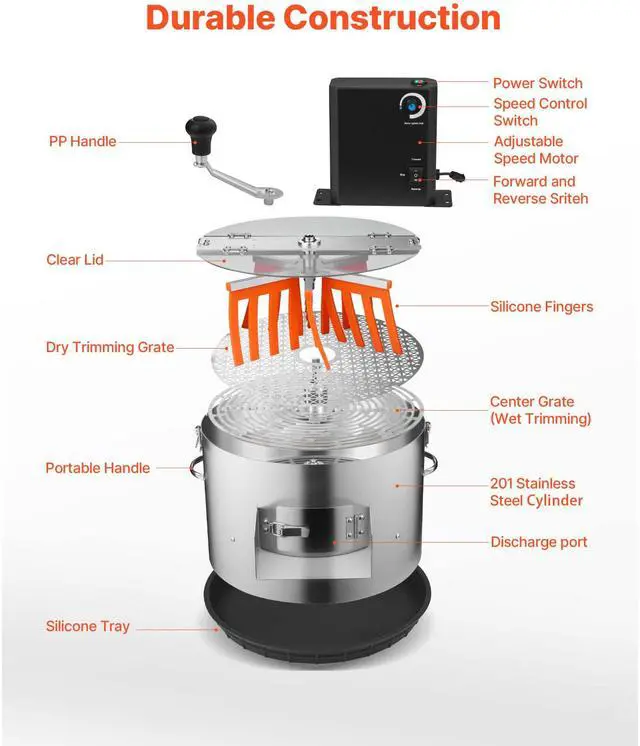 Function: Stepless Speed Regulation,Speed: 1050 r/min ±10%,Bowl Material: 201 Stainless Steel,Blade Fingers: 4 × 3 + 3 × 3,Lid Material: PET,Item Model Number: V-BT-TD-16-US,Item Dimensions: 17.1 × 16.7 × 16.7 in / 435 × 425 × 425 mm,Power: 8W,Weight: 19.8 lbs / 9 kg,Handle: 145° Aluminum Handle (Compatible with Flashlight)