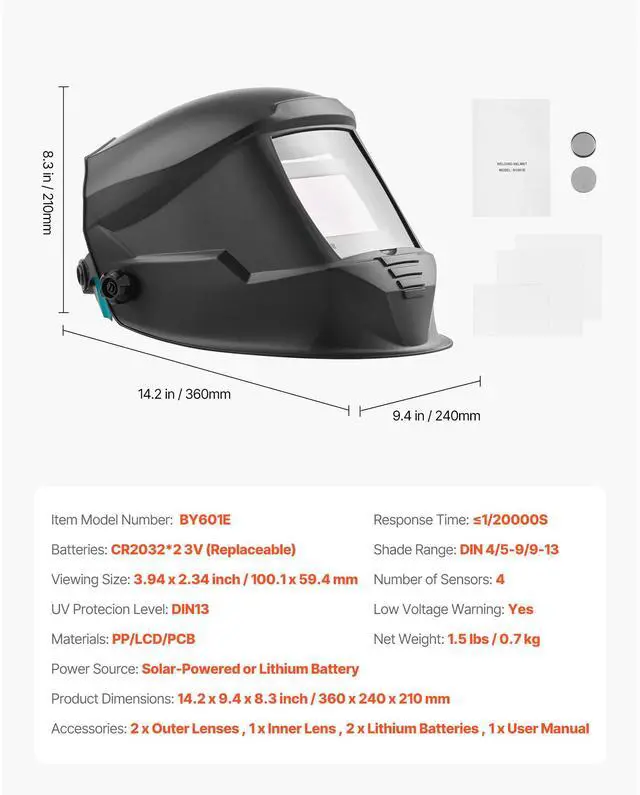 Number of Sensors: 4,Response Time: 1/20000S ,Materials: PP/LCD/PCB,Item Model Number: BY601E,Shade Range: DIN 4/5-9/9-13,Batteries: CR2032*2 3V(Replaceable),Low Voltage Warning: Yes,Product Dimensions: 14.2 x 9.4 x 8.3 inch / 360 x 240 x 210 mm,Net Weight: 1.5 lbs / 0.7 kg,Viewing Size: 3.94 x 2.34 inch / 100 x 59.4 mm
