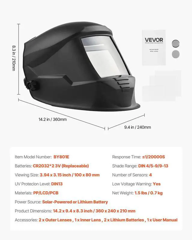 Number of Sensors: 4,Response Time: 1/20000S,Materials: PP/LCD/PCB,Item Model Number: BY801E,Shade Range: DIN 4/5-9/9-13,Batteries: CR2032*2 3V(Replaceable),Low Voltage Warning: Yes,Product Dimensions: 14.2 x 9.4 x 8.3 inch / 360 x 240 x 210 mm,Net Weight: 1.5 lbs / 0.7 kg,Viewing Size: 3.94 x 3.15 inch / 100 x 80 mm