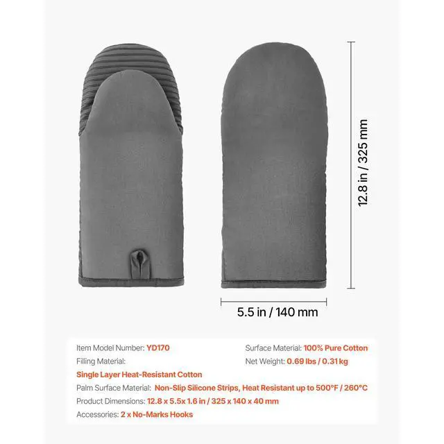 Palm Surface Material: Non-Slip Silicone Strips, Heat Resistant up to 500°F / 260°C,Item Model Number: YD170,Surface Material: 100% Pure Cotton,Filling Material: Single Layer Heat-Resistant Cotton,Product Dimensions: 13.07 x 6.1 x 2.36 inch / 332 x 155 x 60 mm,Net Weight: 0.69 lbs / 0.31 kg