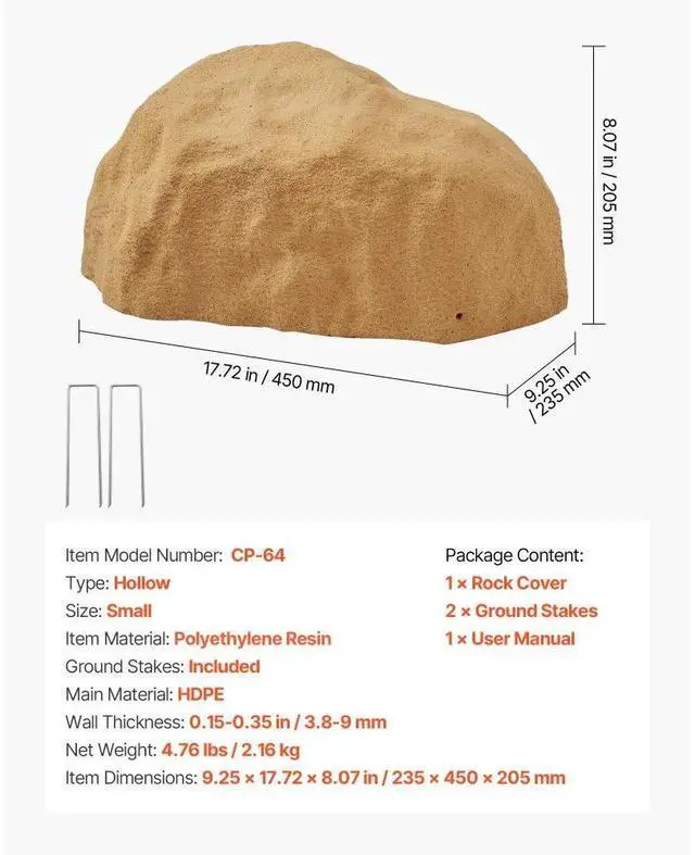 Ground Stakes: Included,Type: Hollow,Item Material: Polyethylene Resin,Size: Small,Item Model Number: CP-64,Wall Thickness: 0.15-0.35 in/3.8-9 mm,Item Dimensions: 9.25 x 17.72 x 8.07 in/235 x 450 x 205 mm,Net Weight: 4.76 lbs/2.16 kg,Main Material: HDPE