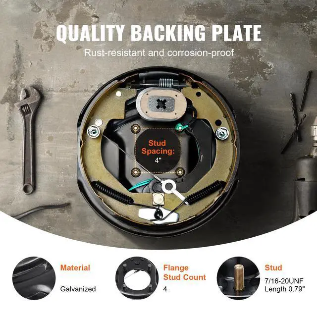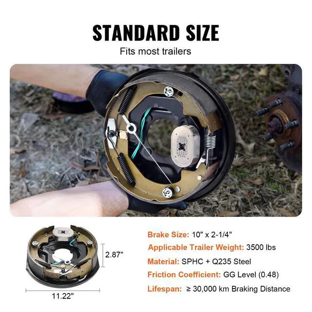 Set Includes: Two Sets (4 Brakes),Material: SPHC + Q235,Brake Pad Adjustability: Self-Adjusting Feature,Magnetic Force: 450N,Applicable Trailer Weight: 3500 lbs,Magnet Size: 10",Friction Coefficient: 0.48,Brake Size: 10" x 2-1/4",Product Size: 11.22" x 2.87",Flange Stud Count: 4,Item Model Number: BF10-Z01A*4,Product Weight: 39.68 lbs,Lifespan: 30,000 km,Voltage/Current: DC12V/2.5-3.6A,Brake Pad Material: Asbestos-Free Semi-Metallic,Brake Pad Size: 2.26" x 0.19"