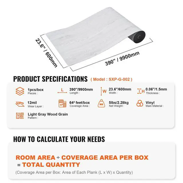 Model: SXP-G-002 Pieces: 1pcs/box Length: 390''/9900mm Width: 23.6 ''/600mm Height: 0.06 ''/ 1.5 mm Wear Layer Thickness: 0.3 mm/12mil Coverage Area: 64² feet/box Pattern: Light Gray Wood Grain Net Weight: 5lbs/ 2.28 kg Main Material: Vinyl