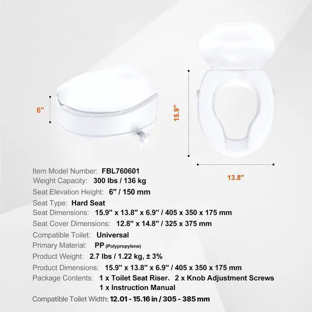 Compatible Toilet: Universal,Primary Material: PP (Polypropylene),Weight Capacity: 300 lbs / 136 kg,Seat Type: Hard Seat,Item Model Number: FBL760601,Seat Cover Dimensions: 12.8" x 14.8" / 325 x 375 mm,Product Weight: 2.7 lbs / 1.22 kg± 3%,Seat Elevation Height: 6" / 150 mm,Seat Dimensions: 15.9" x 13.8" x 6.9" / 405 x 350 x 175 mm,Product Dimensions: 15.9" x 13.8" x 6.9" / 405 x 350 x 175 mm
