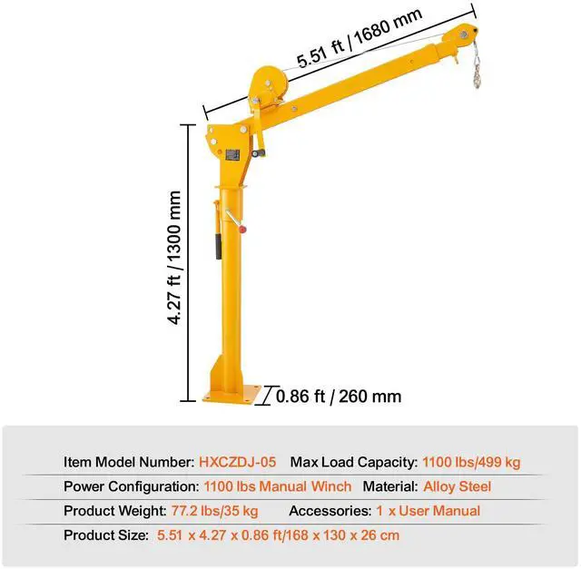 Item Model Number: HXCZDJ-05,Power Configuration: 1100 lbs Manual Winch,Product Weight: 77.2 lbs/35 kg,Max Load Capacity: 1100 lbs/499 kg,Material: Alloy Steel,Product Size: 5.51 x 4.27 x 0.86 ft/168 x 130 x 26 cm