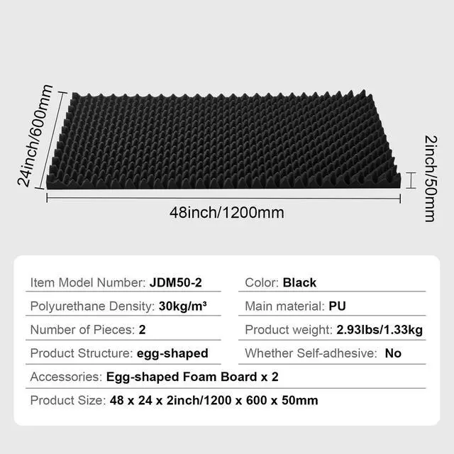 Product Structure: Egg-Shaped,Polyurethane Density: 30kg/m³,Item Model Number: JDM50-2,Product Weight: 2.93lbs/1.33kg,Number of Product Pieces: 2,Whether Self-adhesive: No,Product Size: 48 x 24 x 2inch/1200 x 600 x 50mm