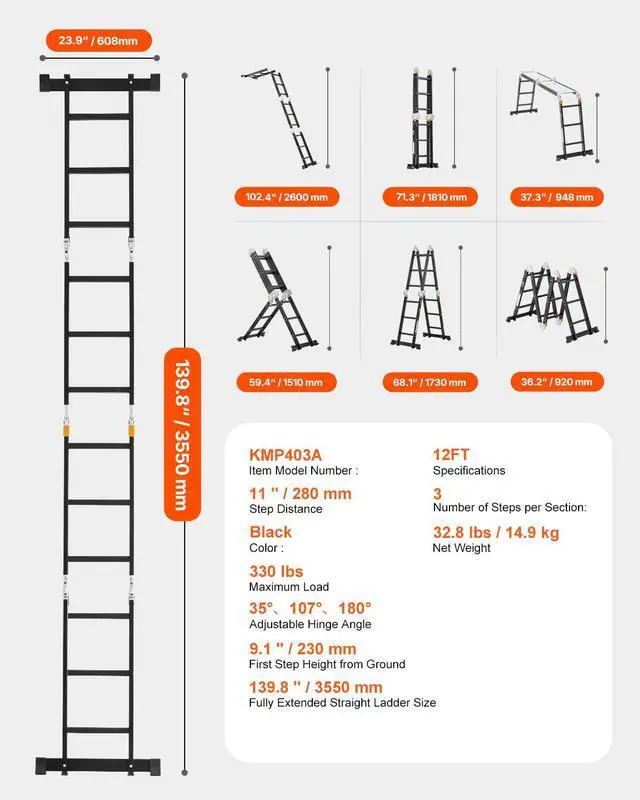 Specifications : 12 ft / 3.7m,Max. Load in Platform Position: 330 lbs / 149.7 kg,Number of Sections: 4 pcs,Max. Load in A-Frame Position: 330 lbs / 149.7 kg,Step Distance: 11 '' / 280 mm,Item Model Number: KMP403A,Item Size(Folded without balance bar): 13.6''x10.4''x38.2'' / 345x265x970 mm,Fully Extended Straight Ladder Size: 139.8 '' / 3550 mm,Item Size(A-frame with balance bar): 46.1''x23.9''x68.1'' / 1170x608x1730 mm,Max. Load in Straight Position: 330 lbs / 149.7 kg,Net Weight: 31.7 lbs / 14.4 kg