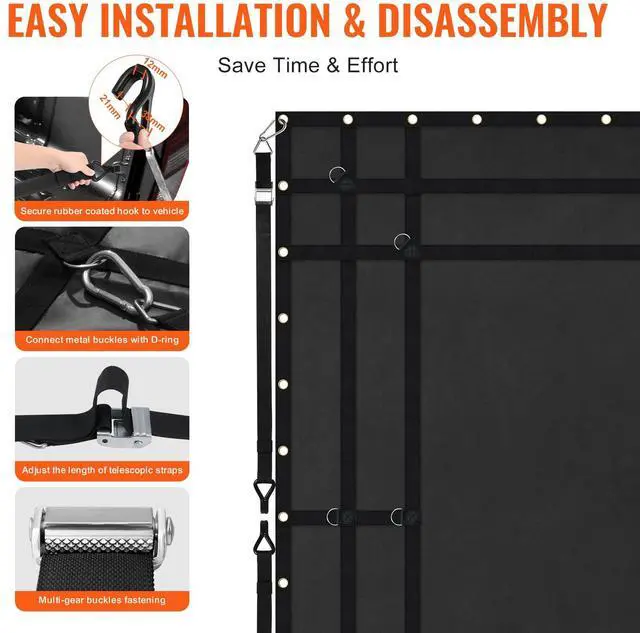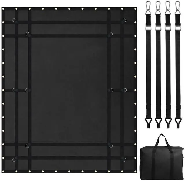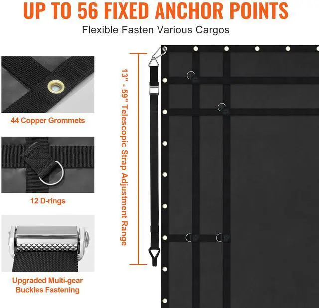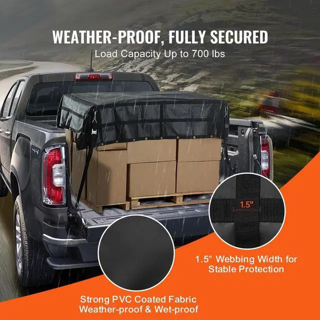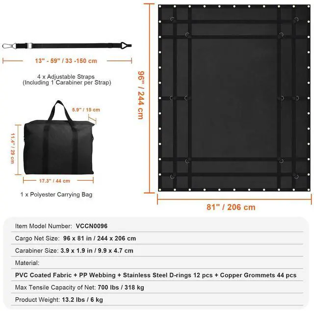 Adjustable Strap Size: 13 - 59 in / 330 - 1500 mm,Waterproof: Yes,Carabiner Size: 3.9 x 1.9 in / 99 x 47 mm,Max Tensile Capacity of Net: 700 lbs / 318 kg,Item Model Number: VCCN0096,Product Weight: 13.2 lbs / 6 kg,Material: PVC Coated Fabric + PP Webbing + Stainless Steel D-rings 12 pcs + Copper Grommets 44 pcs,Cargo Net Size: 96 x 81 in / 2440 x 2060 mm,Product Dimensions: 97.6 x 82.3 x 0.3 in / 2480 x 2090 x 7 mm (Fully Expanded)