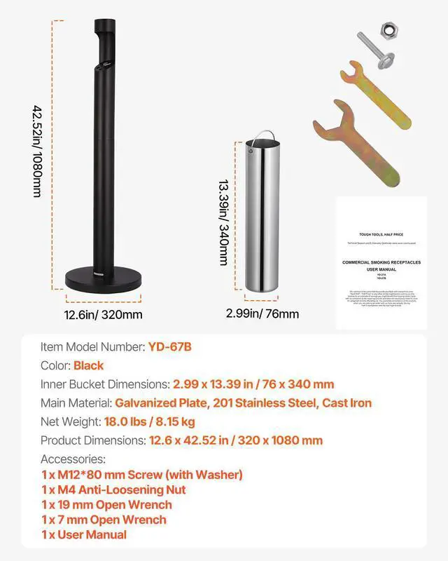 Color: Black,Item Model Number: YD-67B,Product Dimensions: 12.6 x 42.52 in / 320 x 1080 mm,Net Weight:18.0 lbs / 8.15 kg,Inner Bucket Dimensions: 2.99 x 13.39 in / 76 x 340 mm,Main Material: Galvanized Plate, 201 Stainless Steel, Cast Iron