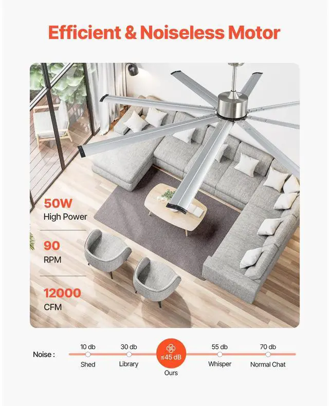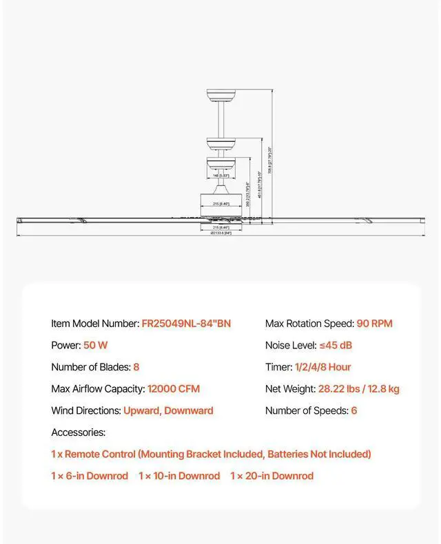 20-in Downrod: 84.25 x 27.79"/2140 x 705.8 mm,Color: Brushed Nickel,Max Airflow Capacity: 12000 CFM,6-in Downrod: 84.25 x 13.79"/2140 x 350.2 mm,Product Dimensions:,Number of Speeds: 6,10-in Downrod: 84.25 x 17.79"/2140 x 451.8 mm,Wind Directions: Upward, Downward,Noise Level: 45 dB,Timer: 1/2/4/8 Hour,Max Rotation Speed: 90 RPM,Item Model Number: FR25049NL-84"BN,Number of Blades: 8,Net Weight: 28.22 lbs / 12.8 kg,Power: 53 W