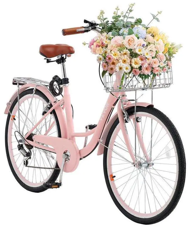 VEVOR Cruiser Bike, 7-Speed, 26-Inch Pink Beach Cruiser Bike with Large Capacity Basket and Rear Rack, Secure & Sturdy Cruiser Bike with Adjustable Seat, Fits for Cycling, Exercise & Shopping