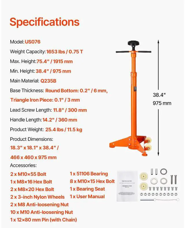 Handle Length: 14.2" / 360 mm,Lead Screw Length: 11.8" / 300 mm,Weight Capacity: 1653.5 lbs / 0.75 t,Item Model Number: US076,Product Weight: 25.4 lbs / 11.5 kg,Maximum Height: 75.4" / 1915 mm,Product Dimensions: 18.3" x 18.1" x 38.4" / 466 x 460 x 975 mm,Main Material: Q235B,Minimum Height: 38.4" / 975 mm