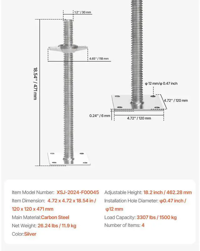 Adjustable Height: 18.2 inch / 462.28 mm,Load Capacity: 3307 lbs / 1500 kg,Item Dimension: 4.72 x 4.72 x 18.54 inch / 120 x 120 x 471 mm,Color: Silver,Item Model Number: XSJ-2024-F00045,Material: Carbon Steel,Installation Hole Diameter: 0.47 inch / 12 mm,Net Weight: 26.24 lbs / 11.9 kg,Number of Items: 4