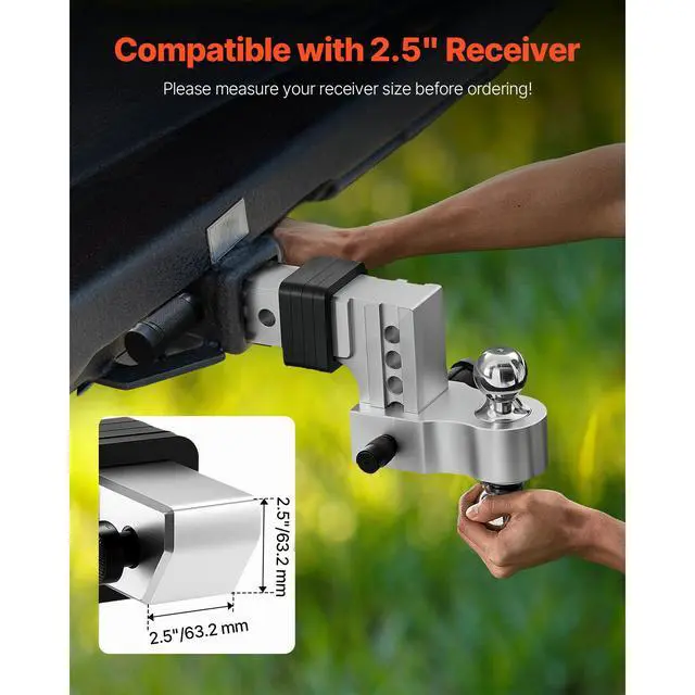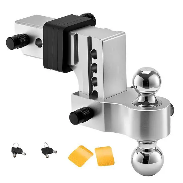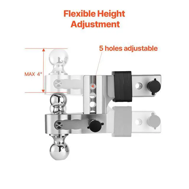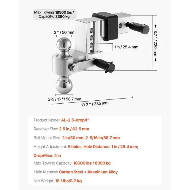Height Adjustment: 5 holes, Hole Distance: 1 in / 25.4 mm; Drop/Rise: 4 in,Type: Double Ball Mount,Receiver Fixing Method: Trailer Lock Securing,Max Towing Capacity: 18500 lbs / 8390 kg,Ball Mount Fixing Method: Trailer Lock Securing,Item Model Number: AL-2.5-drop4",Ball Mount Size: 2 in/50 mm; 2-5/16 in/58.7 mm,Product Dimensions: 13.2 x 12.6 x 8.7 in/335 x 320 x 220 mm,Net Weight: 18.1 lbs/8.2 kg,Main Material: Carbon Steel + Aluminium Alloy,Receiver Size: 2.5 in / 63.5 mm