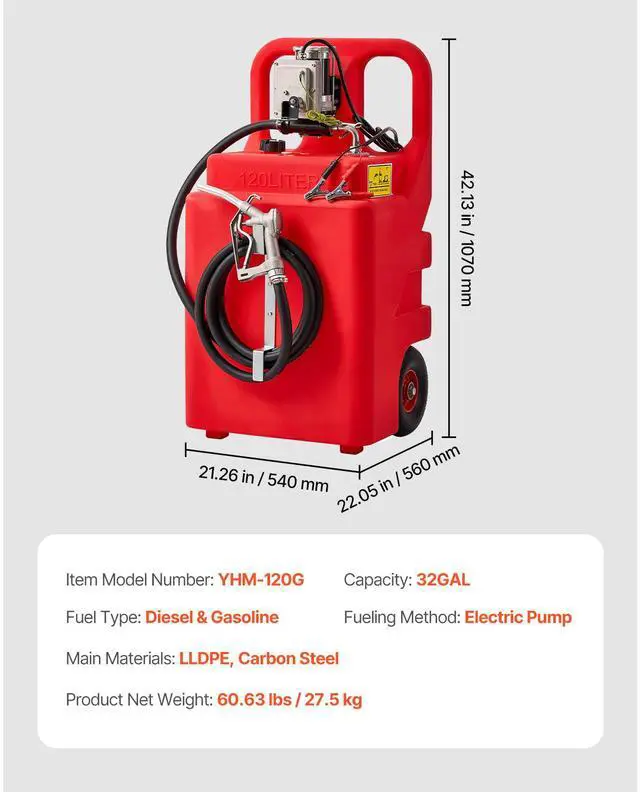 Main Materials: LLDPE, Carbon Steel,Capacity: 32GAL,Item Model Number: YHM-120G,Product Net Weight: 60.63 lbs/27.5kg,Product Dimensions: 21.26 x 18.31 x 42.13 in/540 x 465 x 1070mm (only the tank),Fueling Method: Electric Pump,Fuel Type: Diesel & Gasoline