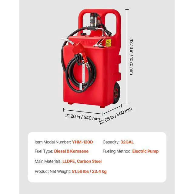Main Materials: LLDPE, Carbon Steel,Capacity: 32GAL,Item Model Number: YHM-120D,Product Net Weight: 51.59 lbs/23.4kg,Product Dimensions: 21.26 x 18.31 x 42.13 in/540 x 465 x 1070mm (only the tank),Fueling Method: Electric Pump,Fuel Type: Diesel & Kerosene