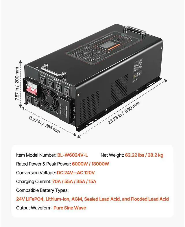 Charging Current: 70A / 55A / 35A / 15A,Item Model Number: BL-W6024V-L,Rated Power & Peak Power: 6000W / 18000W,Conversion Voltage: DC 24V to AC 120V,Compatible Battery Types: 24V LiFePO4, Lithium-ion, AGM, Sealed Lead Acid, and Flooded Lead Acid,Net Weight: 62.22 lbs / 28.2 kg,Output Waveform: Pure Sine Wave