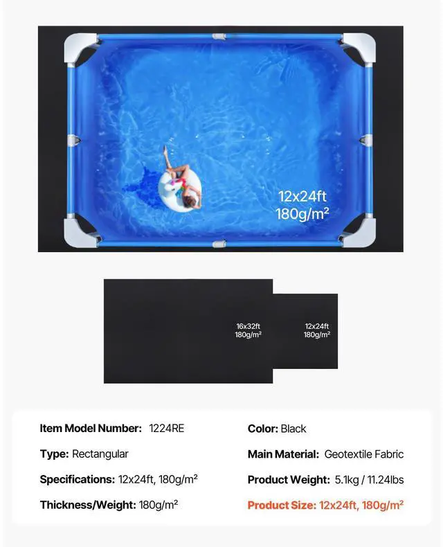 Type: Rectangular,Thickness/Weight: 180g/m²,Specifications: 12x24ft, 180g/m²,Color: Black,Item Model Number: 1224RE,Product Weight:5.1kg / 11.24lbs,Main Material: Geotextile Fabric,Product Size: Rectangle. 12x24ft, 180g/m²