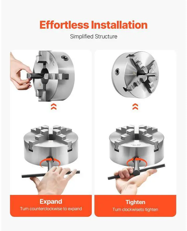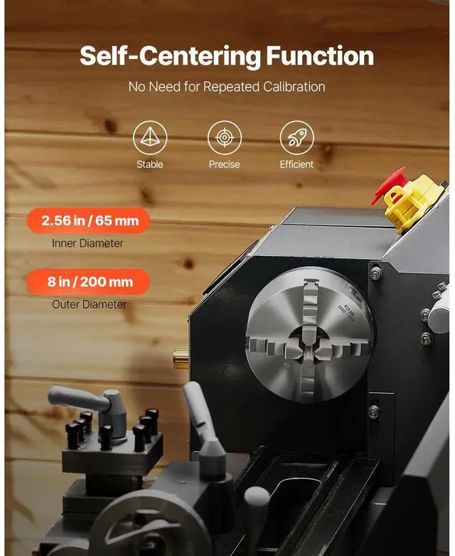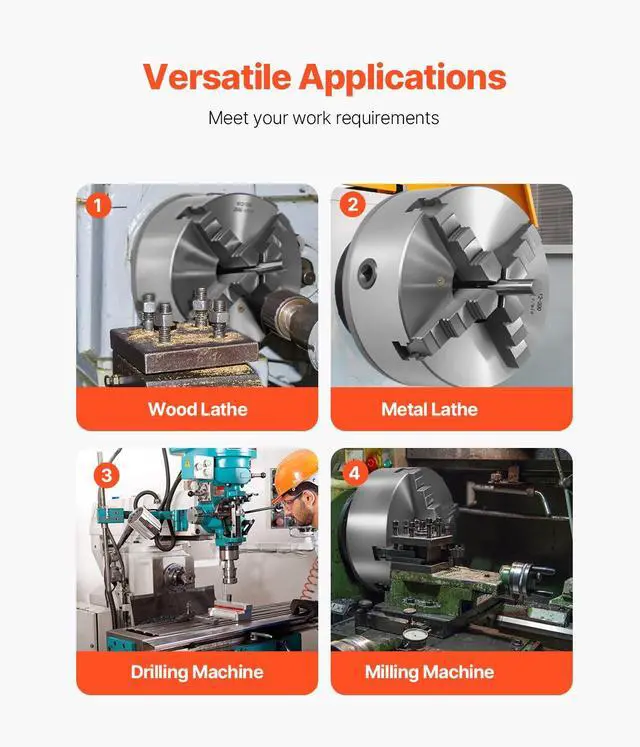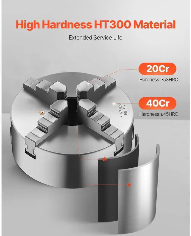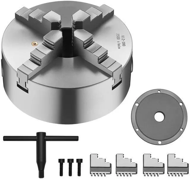 VEVOR 4-Jaw Lathe Chuck, 8 Inch (200 mm), Self-Centering Chuck with 1 1/2 in-8 Threaded Backing Plate, 0.16-7.87 in (4-200 mm) Clamping Range with T-wrench Screws, HT300 Material, for Wood Metal Lathe