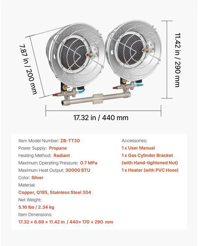 Maximum Heat Output: 30000 BTU,Color: Silver,Item Model Number: ZB-TT30,Heating Method: Radiant,Material: Copper, Q195, Stainless Steel 304,Item Dimensions: 17.32 x 6.69 x 11.42 inches / 440 x 170 x 290 mm,Maximum Operating Pressure: 0.7 MPa,Net Weight: 5.16 lbs / 2.34 kg,Power Supply: Air Power