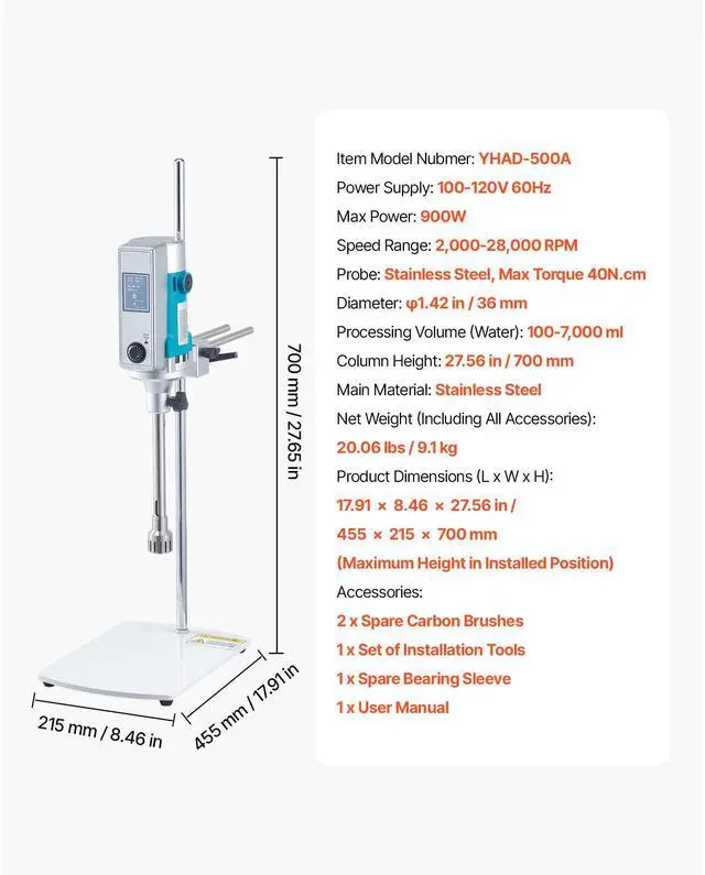 Max Power: 900W,Net Weight (Including All Accessories): 20.06 lbs / 9.1 kg,Column Height: 27.56 in / 700 mm,Item Model Number: YHAD-500A,Processing Volume (Water): 100-7000ml,Product Dimensions (L x W x H): 17.91 x 8.46 x 27.56 in / 455 x 215 x 700 mm,Probe: Stainless Steel,Speed Range: 2000-28000 RPM,Main Material: Stainless Steel,Power Supply: 100-120V 60Hz