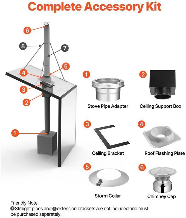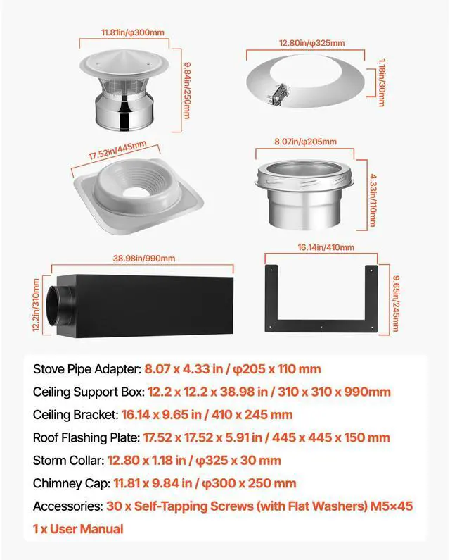 Storm Collar: 12.80 x 1.18 in / 325 x 30 mm,Specifications: 6 inch,Stove Pipe Adapter: 8.07 x 4.33 in / 205 x 110 mm,Ceiling Bracket: 16.14 x 9.65 in / 410 x 245 mm,Color: Silver,Item Model Number: TWS-6-0530K,Roof Flashing Plate: 17.52 x 17.52 x 5.91 in / 445 x 445 x 150 mm,Chimney Cap: 11.81 x 9.84 in / 300 x 250 mm,Ceiling Support Box: 12.2 x 12.2 x 38.98 in / 310 x 310 x 990mm,Net Weight: 22.38 lbs / 10.15 kg,Main Material: SUS 304 Stainless Steel