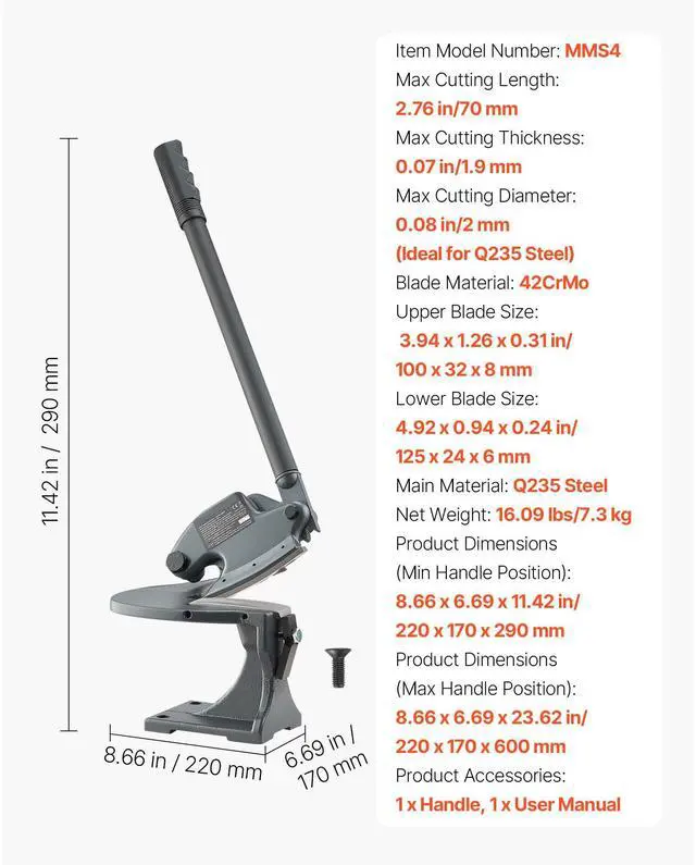 Blade Material: 42CrMo,Max Cutting Length: 2.76 in/70 mm,Max Cutting Diameter: 0.08 in/2 mm (Ideal for Q235 Steel),Product Dimensions (Max Handle Position): 8.66 x 6.69 x 23.62 in/220 x 170 x 600 mm,Item Model Number: MMS4,Lower Blade Size: 4.92 x 0.94 x 0.24 in/125 x 24 x 6 mm,Max Cutting Thickness: 0.07 in/1.9 mm,Upper Blade Size: 3.94 x 1.26 x 0.31 in/100 x 32 x 8 mm,Product Dimensions (Min Handle Position): 8.66 x 6.69 x 11.42 in/220 x 170 x 290 mm,Net Weight: 16.09 lbs/7.3 kg,Main Material: Q235 Steel