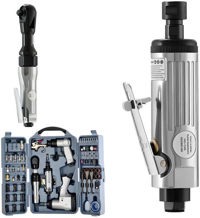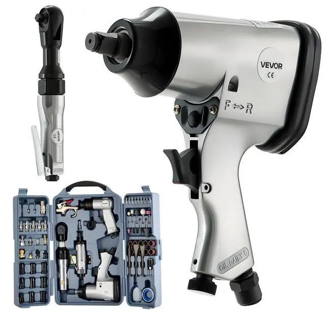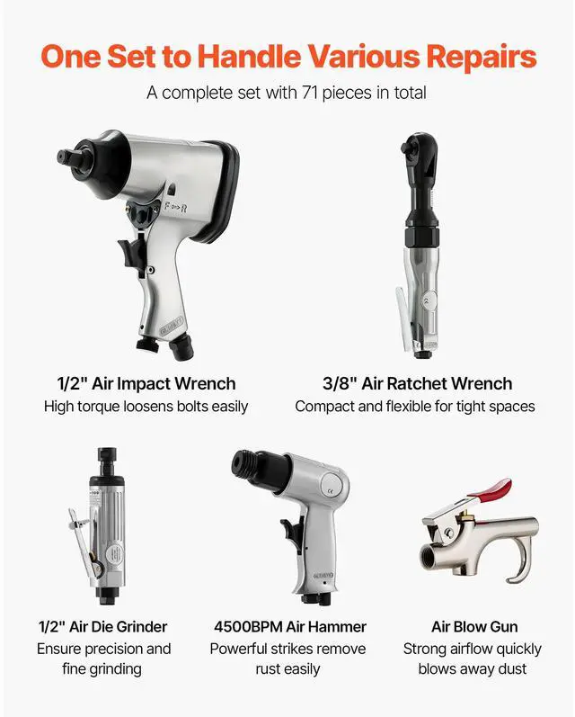 VEVOR 71 Pieces Pro Air Tool and Accessories Kit - 1/2" Air Impact Wrench, 3/8" Ratchet Wrench, 1/2" Die Grinder, 4500BPM Hammer, Blow Gun for Auto Repair, Home DIY Project - Storage Case Included