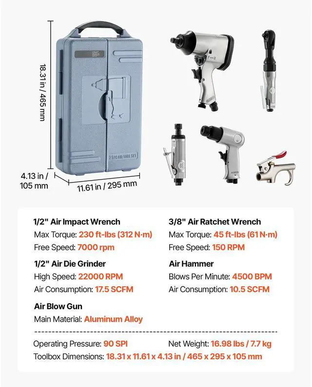 Operating Pressure: 90 SPI,1/2" Air Die Grinder: 22000 RPM,1/2" Air Impact Wrench: 230 ft-lbs; 7000 rpm,Toolbox Dimensions: 18.31 x 11.61 x 4.13 in / 465 x 295 x 105 mm,Air Hammer: 4500 BPM,3/8" Air Ratchet Wrench: 45 ft-lbs ; 150 RPM,Item Model Numbber: WF-016,Net Weight: 16.98 lbs / 7.7 kg