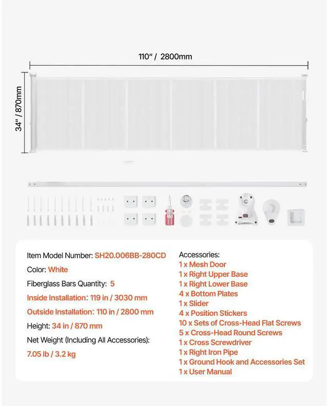 Net Weight (Including All Accessories): 7.05 lb / 3.2 kg,Color: White,Item Model Number: SH20.006BB-280CD,Max Curtain Unfolded Width(Outside Install): 110 in / 2800 mm,Total Height: 34 in/870 mm