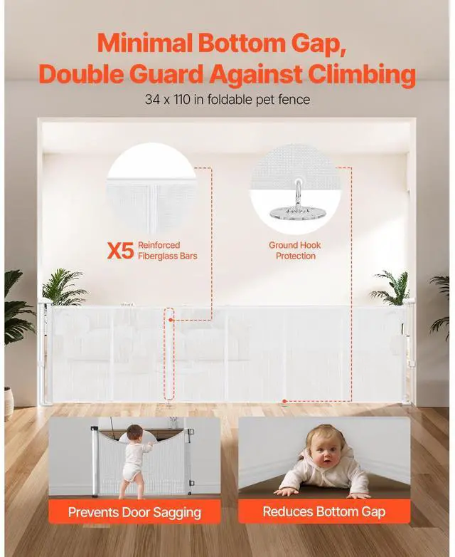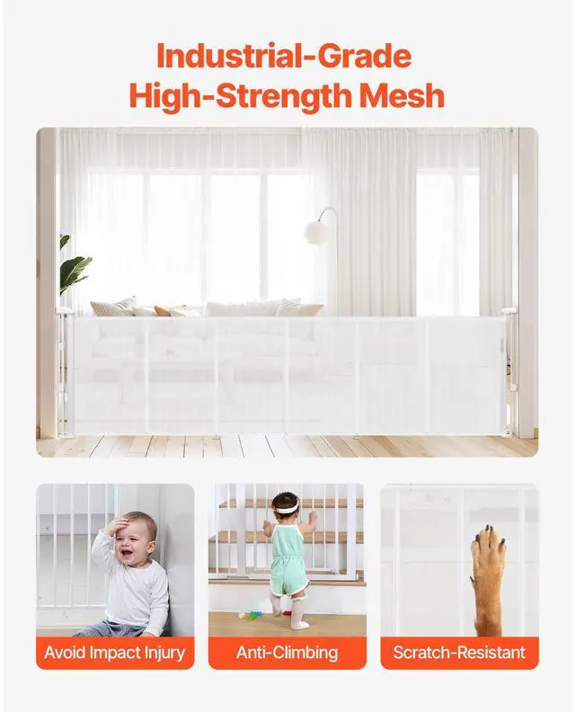 VEVOR Retractable Baby Gate, 34 inch Tall, Extends up to 110 inch Wide, Retractable Gate for Kids or Pets, Mesh Material, Easy to Install for Indoor Stairs, Doorways, Hallways, Playrooms, White