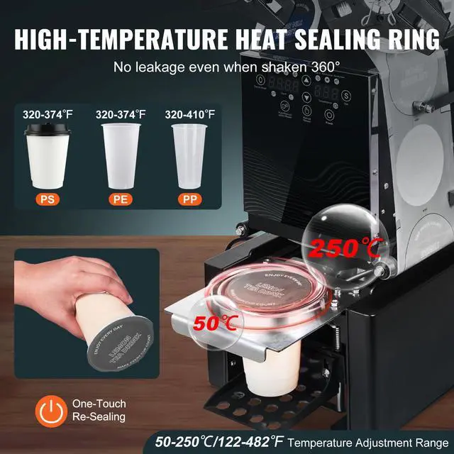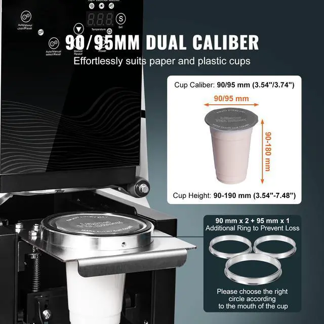 VEVOR Fully Automatic Cup Sealing Machine, 500-650 Cups/H, Cup Sealer Machine for 190 mm Tall & 90/95 mm Cup, Electric Tea Sealer with Digital Control LCD Panel for Bubble Milk Tea Coffee, Black