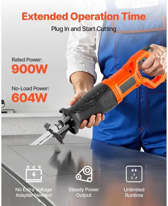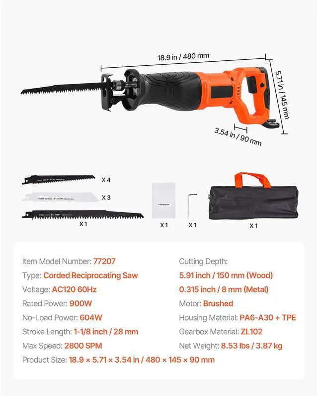 No-Load Power: 604W,Cutting Depth(Wood): 5.91 inch / 150 mm,Motor: Brushed,Cutting Depth(Metal): 0.315 inch / 8 mm,Housing Material: PA6-A30 + TPE,Product Size: 18.9 x 5.71 x 3.54 in / 480 x 145 x 90 mm,Gearbox Material: ZL102,Type: Corded Reciprocating Saw,Voltage: AC120 60Hz,Item Model Number: 77207,Rated Power: 900W,Stroke Length: 1-1/8 inch / 28 mm,Net Weight: 8.53 lbs / 3.87 kg,Max Speed: 2800 SPM