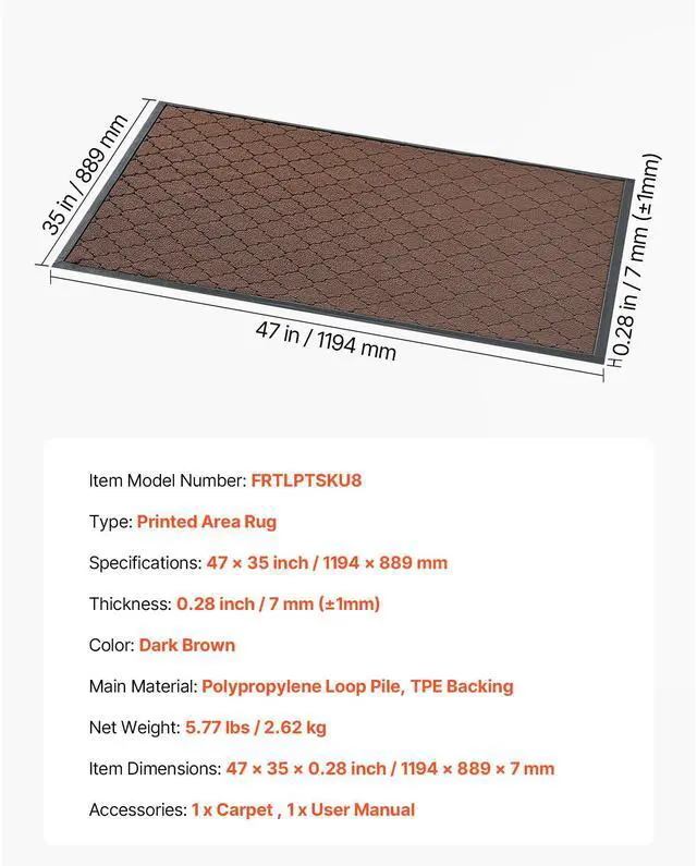 Thickness: 0.28 in / 7 mm,Type: Printed Pattern Carpet,Size: 47 x 35 in / 1194 x 889 mm,Color: Brown,Item Model Number: FRTLPTSKU8,Product Dimensions: 47 x 35 x 0.28 in / 1194 x 889 x 7 mm,Net Weight: 5.6 lbs / 2.54 kg,Main Material: Carpet Surface: Polypropylene (Loop Pile), Backing: TPE
