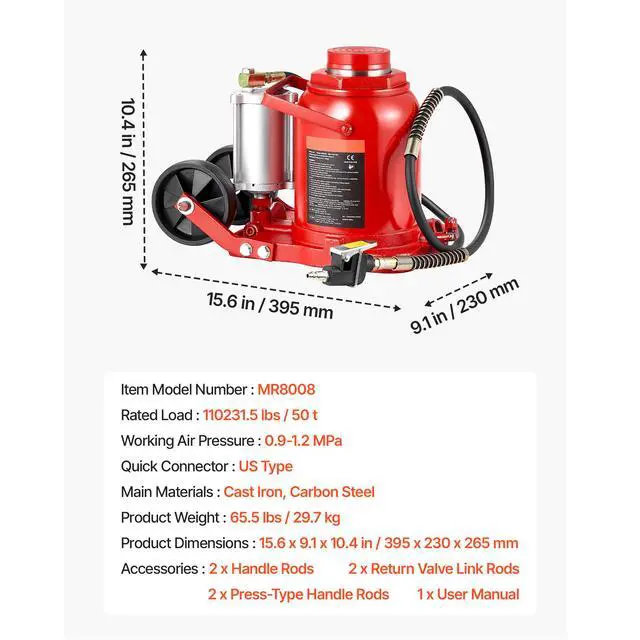 Main Materials: Cast Iron, Carbon Steel,Item Model Number: MR8008,Working Air Pressure: 0.9-1.2 MPa,Product Weight: 65.5 lbs/29.7 kg,Product Dimensions: 15.6 x 9.1 x 10.4 in/395 x 230 x 265 mm,Lifting Range: 10.4-16.1 in/265-410 mm,Rated Load: 110231.5 lbs/50 t