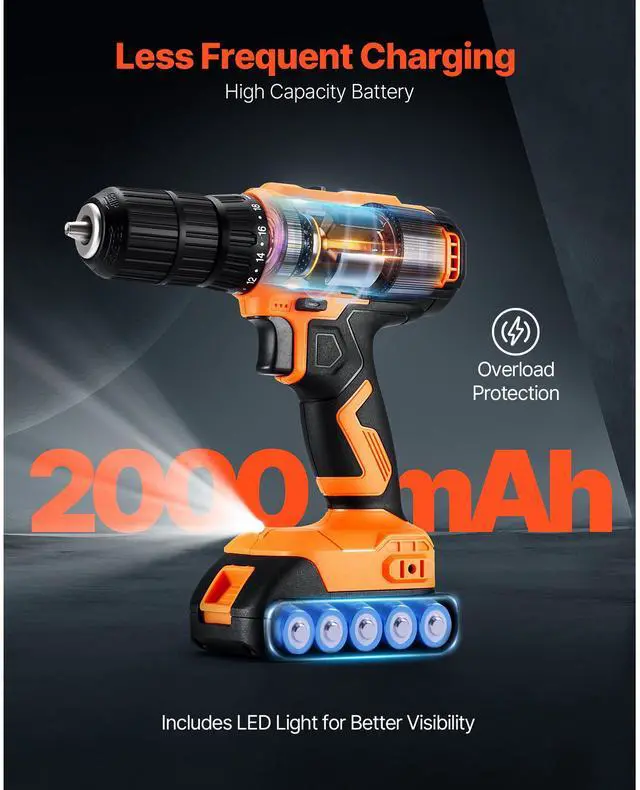 VEVOR Cordless Drill Driver, 1/2 inch Metal Chuck, Dual-Speed Variable, Drill Driver Kit with Lithium Battery and Charger, Belt Clip, for Wood and Metal Drilling, Screw Tightening or Loosening