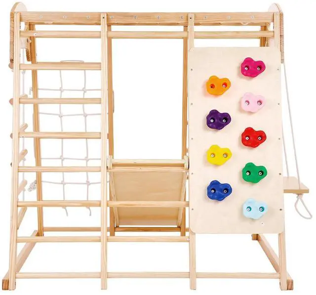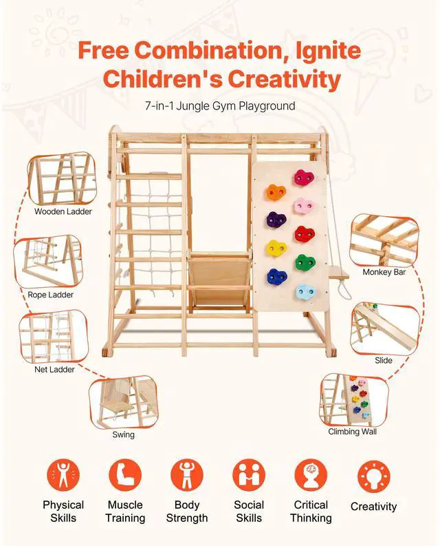 VEVOR Indoor Jungle Gym, 7-in-1 Toddler Indoor Playground, 43 x 47.2 x 47 inch, with Wood and Rope Ladder, Net Ladder, Swing, Monkey Bar, Slide, Climbing Wall, Wooden Indoor Climbing Toys for Kids