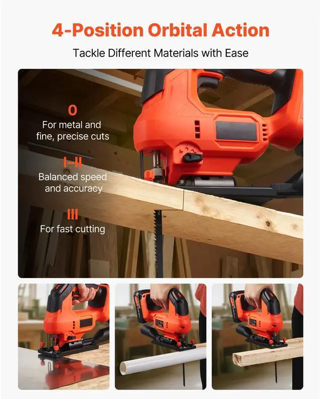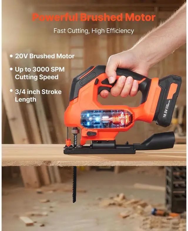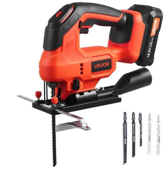 VEVOR Cordless Jig Saw, 20 V, 3000 SPM Blade Speed, Cordless Jigsaw with Battery and Charger, LED Light, 6 Variable Speed, 0- 45° Bevel Cuts, with 6 pcs Blades, 4 Orbital Settings, for Wood, Metal