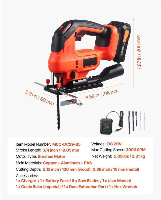 Max Cutting Speed: 3000 SPM,Cutting Depth: 5.12 inch / 130 mm (wood), 0.39 inch / 10 mm (metal),Main Materials: Copper + Aluminum + PA6,Voltage: DC 20V,Motor Type: Brushed Motor,Item Model Number: M0Q-DC29-65,Stroke Length: 3/4 inch / 19.05 mm,Product Dimensions: 8.58 x 3.15 x 7.87 in / 218 x 80 x 200 mm,Net Weight: 5.09 lbs / 2.31 kg
