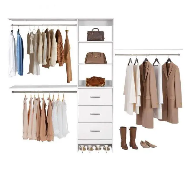 VEVOR Closet System with 3 Drawers, Adjustable Height Wooden Closet Organizers, Modern Walk-in Wardrobe Organization with 3 Retractable Clothes Hanger Rods, Freestanding Garment Rack Storage, White