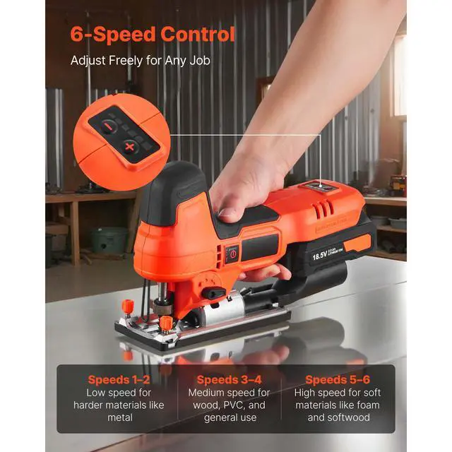 VEVOR Cordless Jig Saw, 20 V Brushless Motor, 3500 SPM Blade Speed, Cordless Jigsaw with 6 pcs Blades, LED Light, 6 Variable Speed, 0- 45° Bevel Cuts, 4 Orbital Settings for Straight/Circle Cutting
