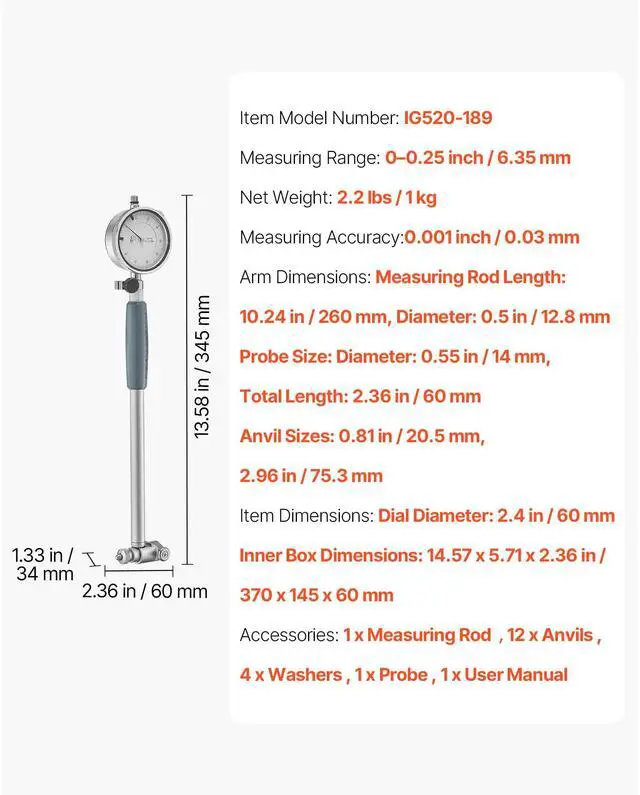 Dial Diameter: 2.4 inch / 60 mm,Inner Box Dimensions: 14.57 x 5.71 x 2.36 inch / 370 x 145 x 60 mm,Measuring Range: 00.25 inch / 06.35 mm,Measuring Accuracy: 0.001 inch / 0.03 mm,Item Model Number: IG520-210,Net Weight: 2.2 lbs / 1 kg,Base Type: Not Included