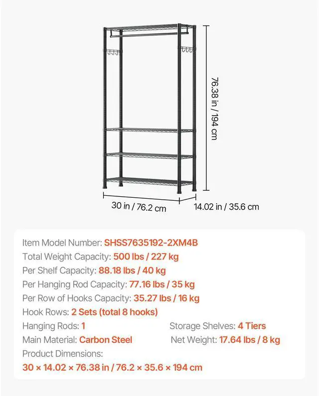 Per Shelf Capacity: 88.18 lbs / 40 kg,Per Row of Hooks Capacity: 35.27 lbs / 16 kg,Hook Rows: 2 Sets (total 8 hooks),Total Weight Capacity: 500 lbs / 227 kg,Storage Shelves: 4 Tiers,Hanging Rods: 1,Item Model Number: SHSS7635192-2XM4B,Product Dimensions: 30 x 14.02 x 76.38 in / 76.2 x 35.6 x 194 cm,Per Hanging Rod Capacity: 77.16 lbs / 35 kg,Net Weight: 17.64 lbs / 8 kg,Main Material: Carbon steel