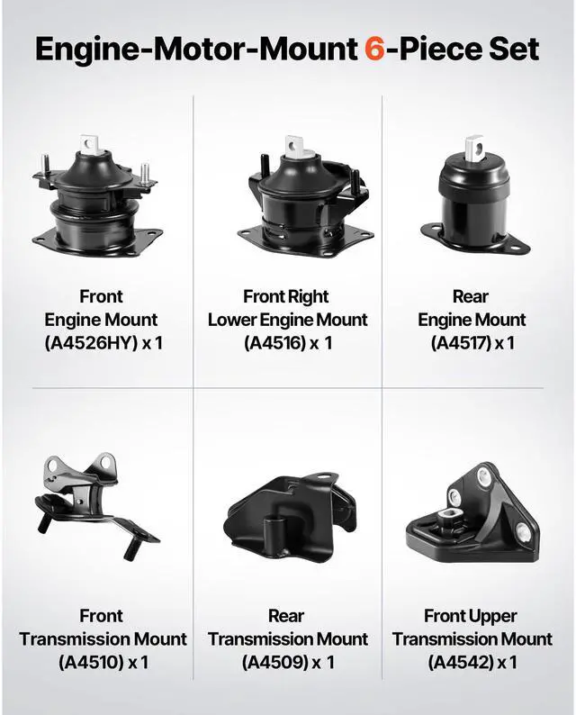 VEVOR Engine Motor Mount and Transmission Mount Kit Replacement, Set of 6, Compatible with 20032007 Honda Accord 2.4L L4, Replace OE# A4526HY, A4517, A4516, A4510, A4509, A4542, Secure Support