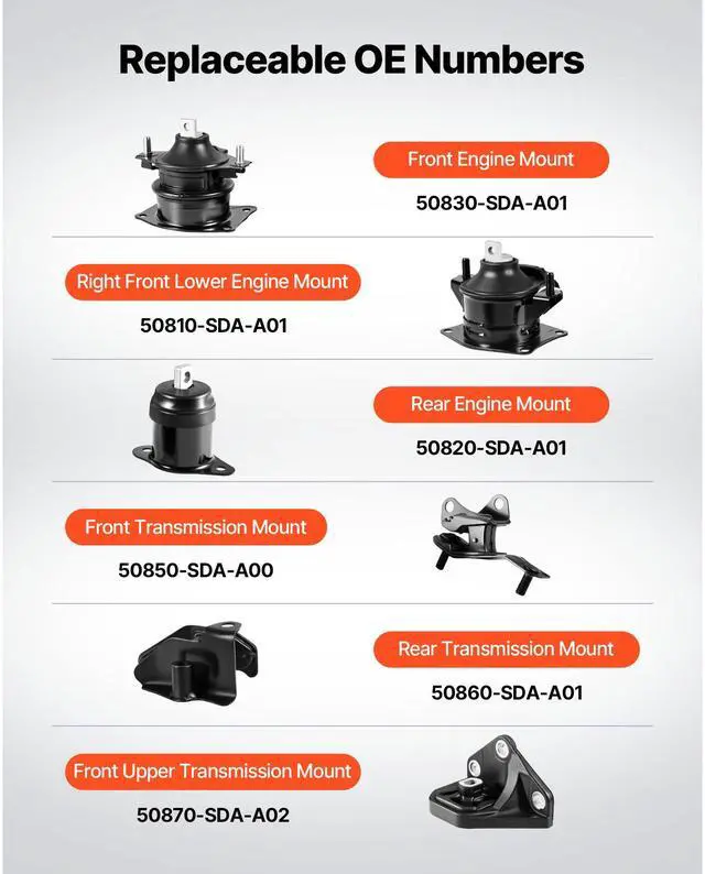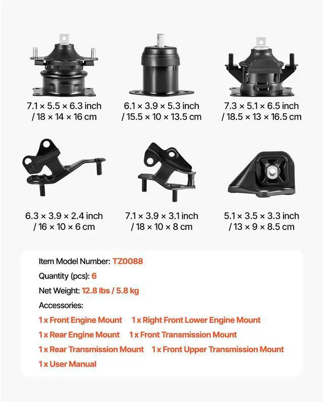Kit Contents: Front, Front Right Lower, Rear, Front Trans, Rear Trans, Front Upper Trans Mounts,OE Number: A4526HY, A4517, A4516, A4510, A4509, A4542,Item Model Number: TZ0088,Quantity: 6 PCS,Compatible Vehicles: Honda Accord L4 2.4L (2003-2007),Material: Iron, Aluminum,Item Dimensions: 7.1 x 5.5 x 6.3 in / 180 x 140 x 160 mm,Net Weight: 12.8 lbs / 5.8 kg