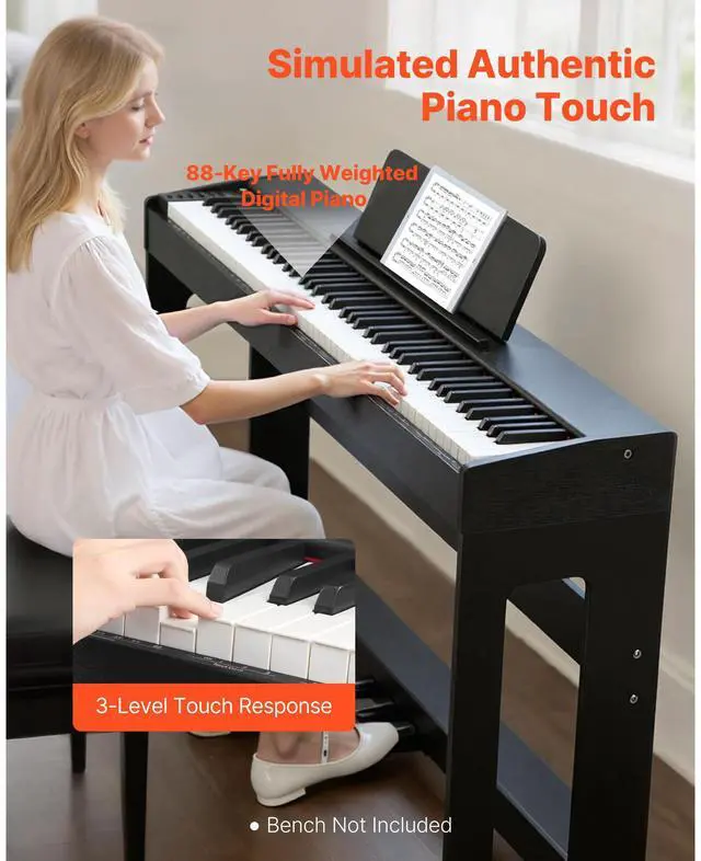 VEVOR Weighted Digital Piano, 88 Keys Fully Weighted, Electric Piano Keyboard with Furniture Stand, Power Adapter, Triple Pedal, Record Function, 280 Tones, Wireless Connection, for Beginners, Black
